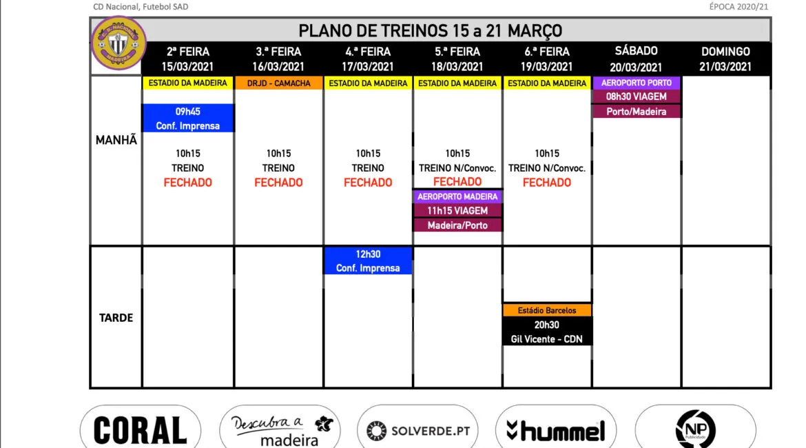 Plano de treinos da equipa sénior de futebol para a semana de 15 a 21 de março.