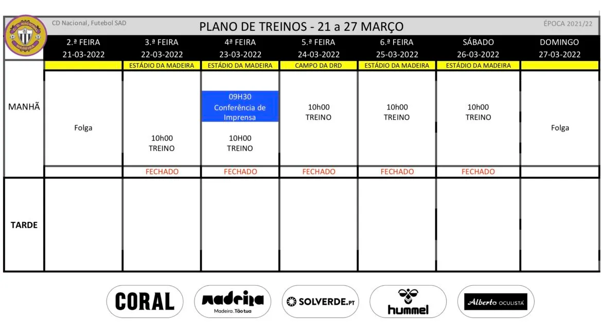 Plano de treinos da equipa de futebol profissional para a semana de 21 a 27 de Março.