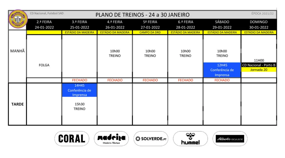 Plano de treinos da equipa de futebol profissional para a semana de 24 a 30 de Janeiro.