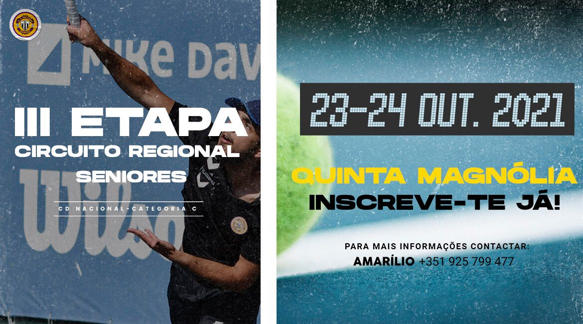 Continuam a decorrer até o dia 20 de Outubro as inscrições para a 3ª etapa do Circuito Regional de Seniores em Ténis, uma prova organizada pela Seção do C.D. Nacional. Uma competição de categoria C incluída no calendário nacional da modalidade, que será disputada a 23 e 24 de Outubro, na Quinta Magnólia.