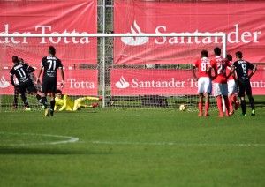 À passagem da meia hora surge finalmente o golo tão merecido pela formação alvi-negra, através de Ricardo, na transformação irrepreensível de uma grande penalidade indiscutível.