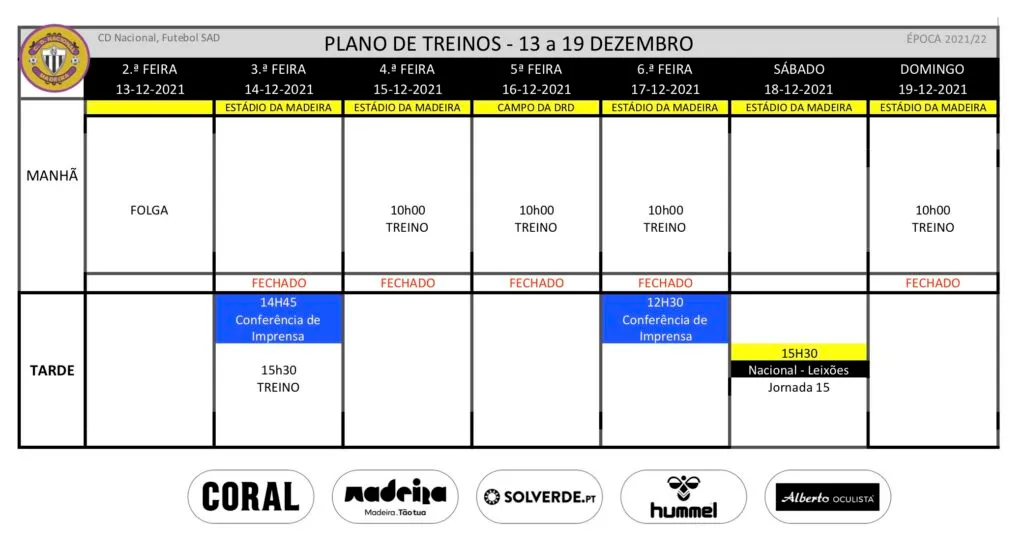 Plano de treinos da equipa de futebol profissional para a semana de 13 a 19 de Dezembro.