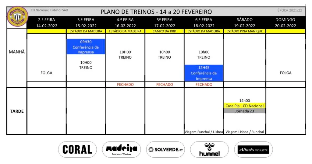 Plano de treinos da equipa de futebol profissional para a semana de 14 a 20 de Fevereiro.
