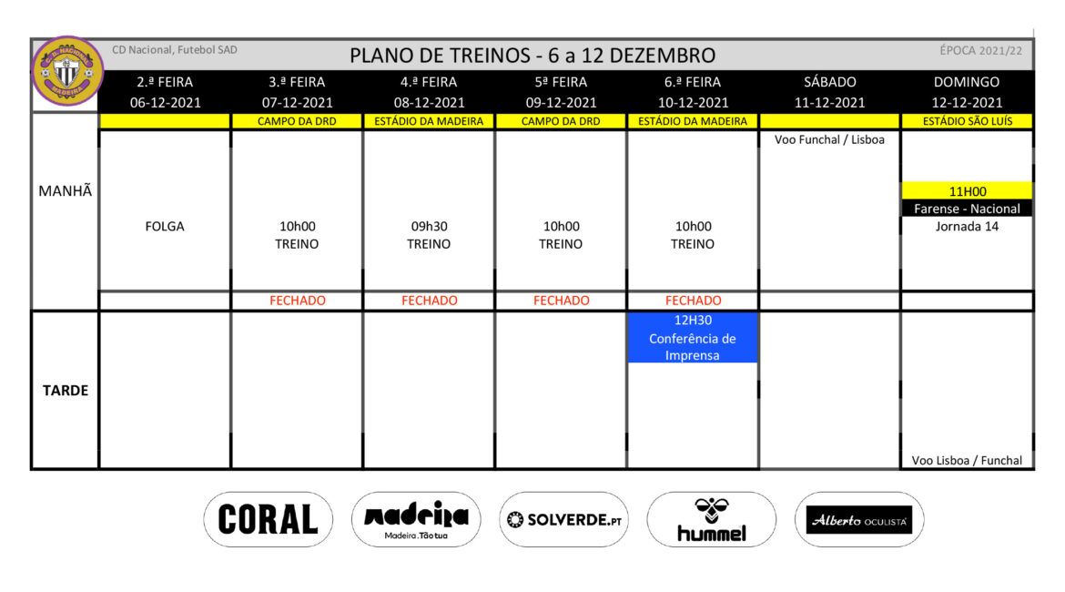 Plano de treinos da equipa de futebol profissional para a semana de 6 a 12 de Dezembro.