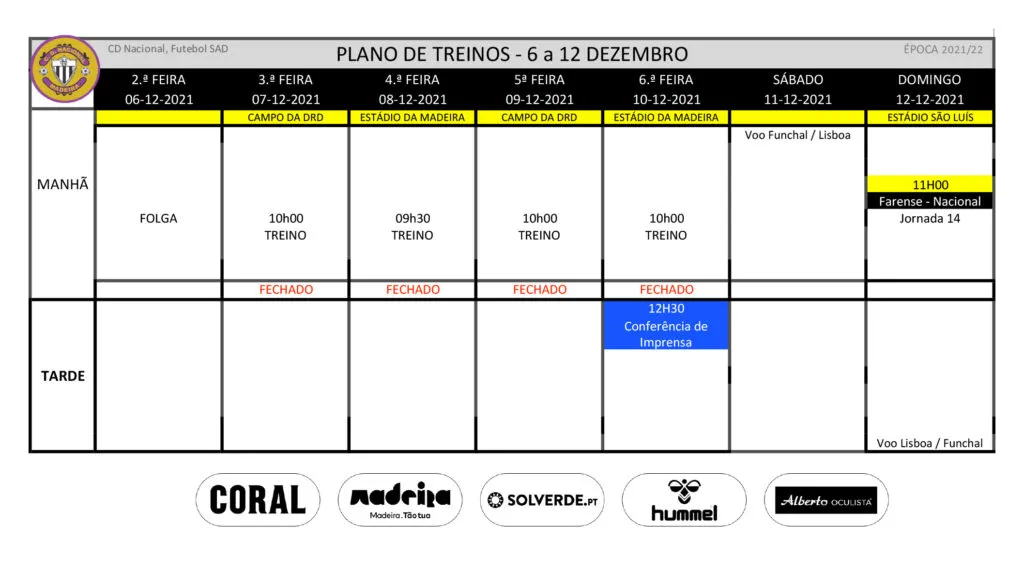 Plano de treinos da equipa de futebol profissional para a semana de 6 a 12 de Dezembro.