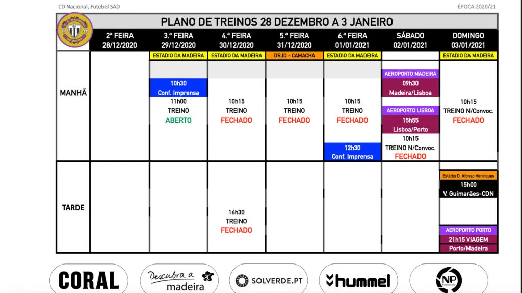 Plano de treinos equipa sénior de futebol para a semana de 28 dezembro a 3 janeiro.