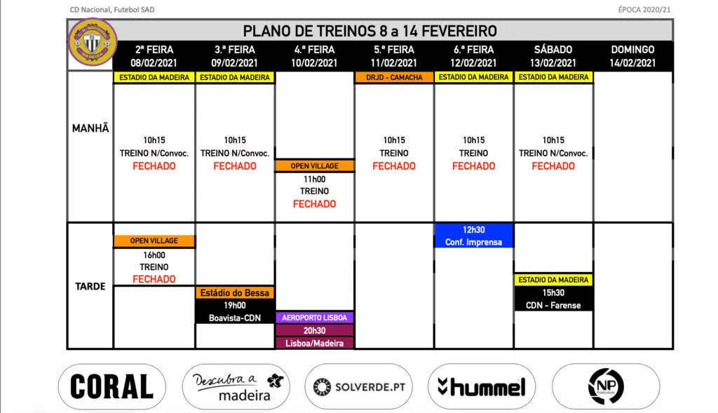 Plano de treinos equipa sénior de futebol para a semana de 8 a 14 de fevereiro.