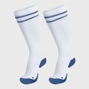 Cor: Branco/Azul. Meias compridas. Apoio no arco do pé. 70% polipropileno + 21% poliamida + 7% algodão + 2% elastano.